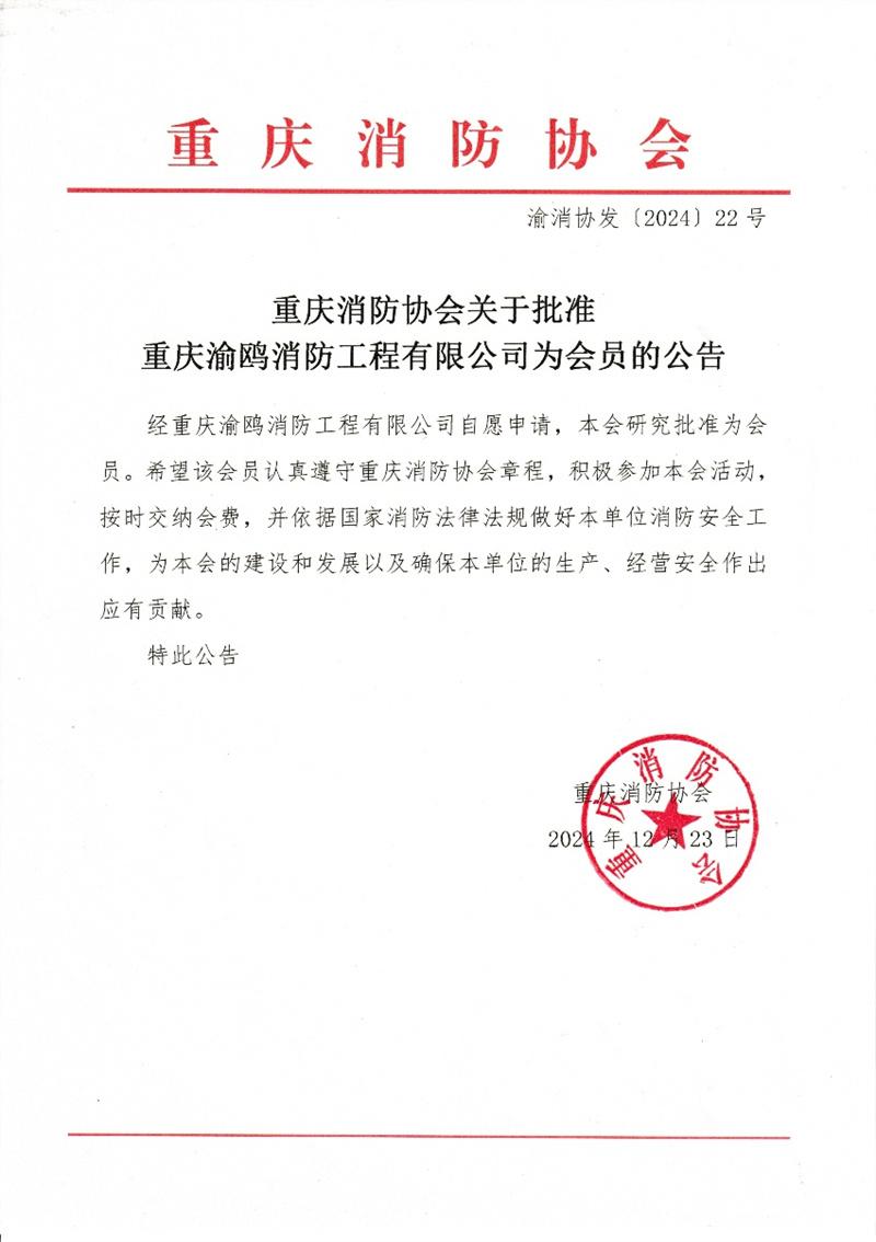 重庆消防协会关于批准重庆渝鸥消防工程有限公司为会员的公告
