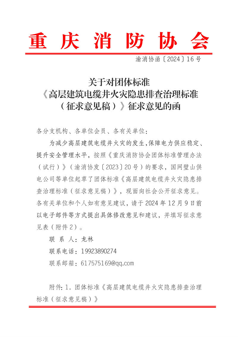 关于对团体标准《高层建筑电缆井火灾隐患排查治理标准(征求意见稿)》征求意见的函