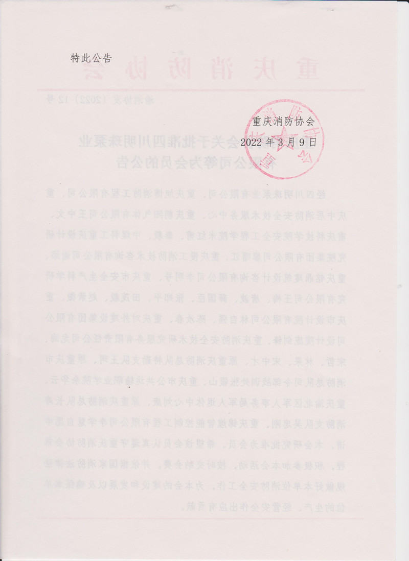 重庆消防协会关于批准重庆鹏贵建设工程有限公司等为会员的公告