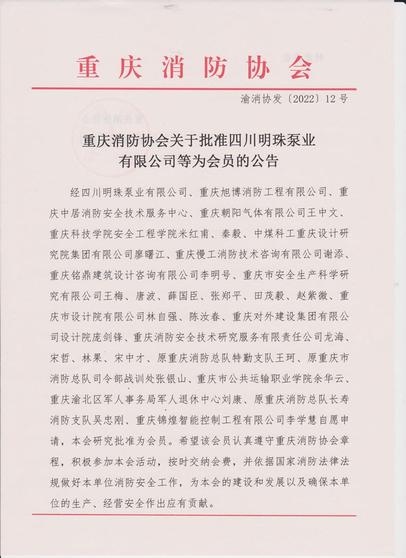 重庆消防协会关于批准四川明珠泵业有限公司等为会员的公告