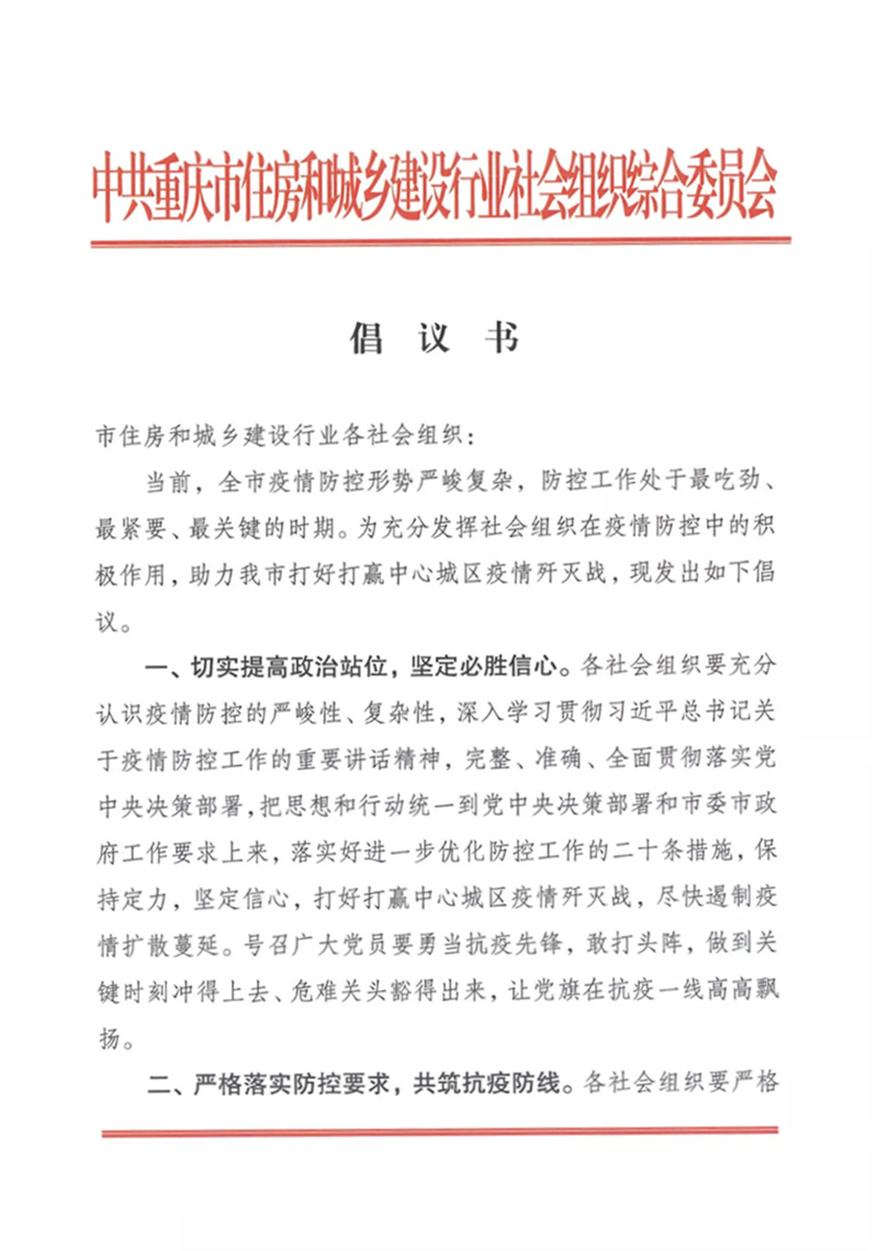 中共重庆市住房和城乡建设行业社会组织综合委员会发布了关于新冠疫情的倡议书,请大家认真学习,遵守疫情防控规定,做好疫情防控工作。