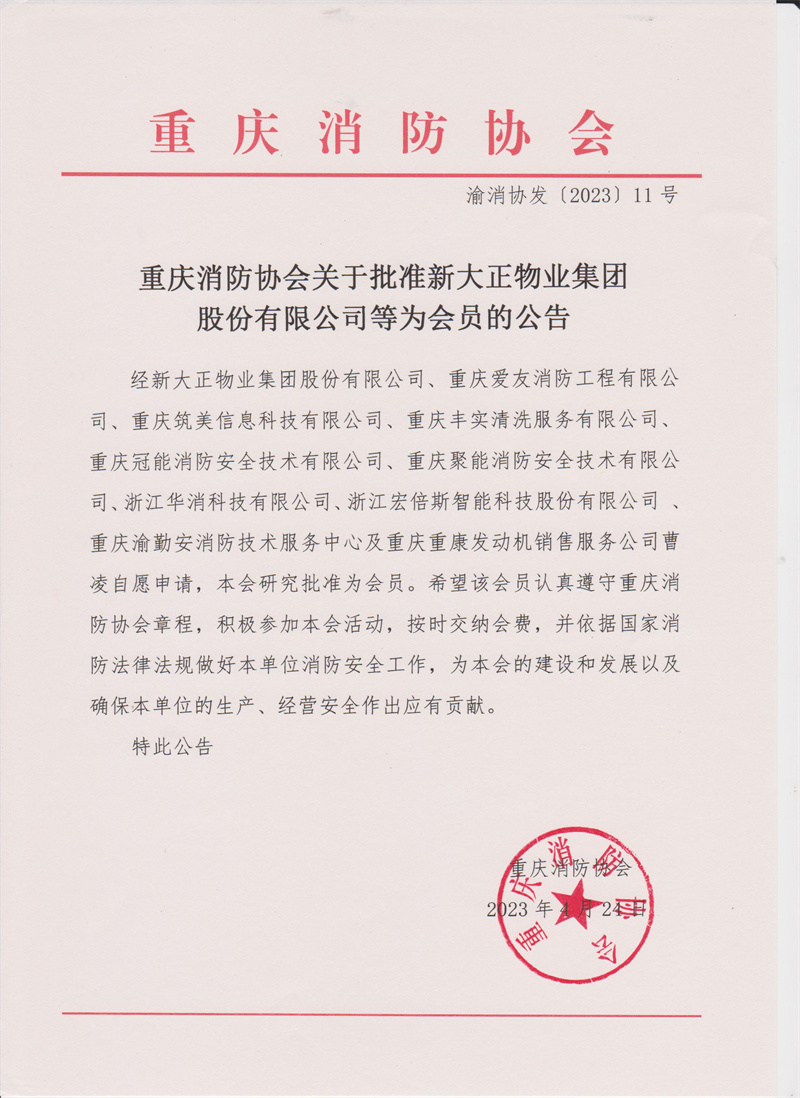 重庆消防协会关于批准新大正物业集团股份有限公司等为会员的公告